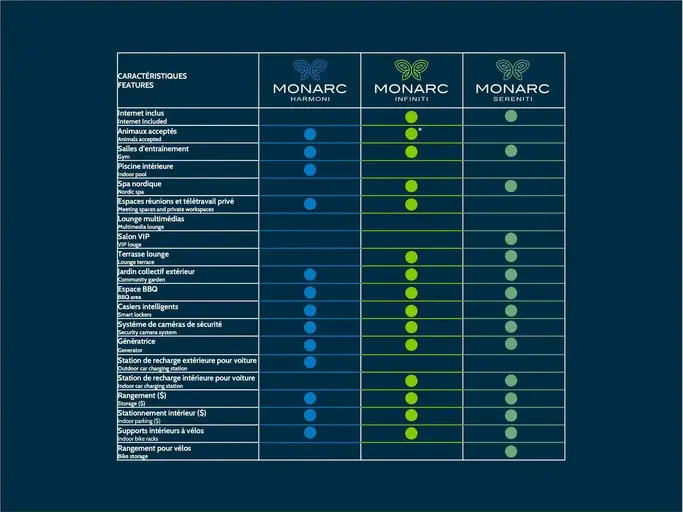 À la recherche d’un milieu de vie qui vous ressemble ?Choisissez votre unité chez Monarc Collection : Harmoni, Infiniti ou Sereniti. Situés au cœur de Ville Saint-Laurent, nos condos neufs à louer vous placent au centre de tous les services et à proximité du réseau de transport en commun, à deux pas du parc Marcel-Laurin et de ses espaces verts luxuriants.Profitez d’appartements modernes et d’un nombre impressionnant de commodités de première classe. Il ne vous reste qu’à choisir la communauté Monarc qui répond le mieux à vos aspirations.Appartements à louer, allant des studios aux 3 chambres.Inclusions :Électroménagers de la cuisineLaveuse / sécheuseClimatisation muraleEau chaudeCasiers intelligentsInternet haute vitesse (Sereniti et Infiniti)Luminaire salle à manger (Sereniti et Infiniti)Revêtement fenêtres (Sereniti et Infiniti)Chacune des phases de la Collection Monarc offre une expérience distinctive, selon vos aspirations. MONARC HARMONIConfort et convivialité dans des appartements spacieux, parfaits pour les personnes seules comme pour les familles. Votre compagnon à quatre pattes est aussi le bienvenu ! Profitez d’espaces communs élégants au Harmoni, signés Lemay+Escobar Design:Piscine intérieureAnimaux domestiques acceptésTerrasse extérieureEspaces télétravailSalle d’entraînementEt bien plus ! MONARC INFINITI Bénéficiez des nombreux espaces de vie stimulants du Infiniti pour connecter, partager des expériences et faciliter votre quotidien actif et urbain.Espaces communs Infiniti: Espaces réunion et télétravailLounge multimédiasTerrasse extérieureBar loungeSalle d’entraînement Et bien plus ! MONARC SERENITIOffrez-vous un lieu de vie où règnent confort, sérénité et raffinement. Votre oasis privée Sereniti propose un environnement relaxant.Profitez d’aires communes exclusives au Sereniti, axées sur la détente et le bien-être : Lobby luxueuxBain romainEspace spaTerrasse extérieureSalle d’entraînementEt bien plus !-------------Exclusive Offer: Free Month & More*1 Bedroom – 1st month free*2 & 3 Bedroom – 1st month free* + $1000 credit toward moving with Déménagement CAParking included for the first year on select units*Limited time offers. Conditions apply. Contact our leasing team for full details.